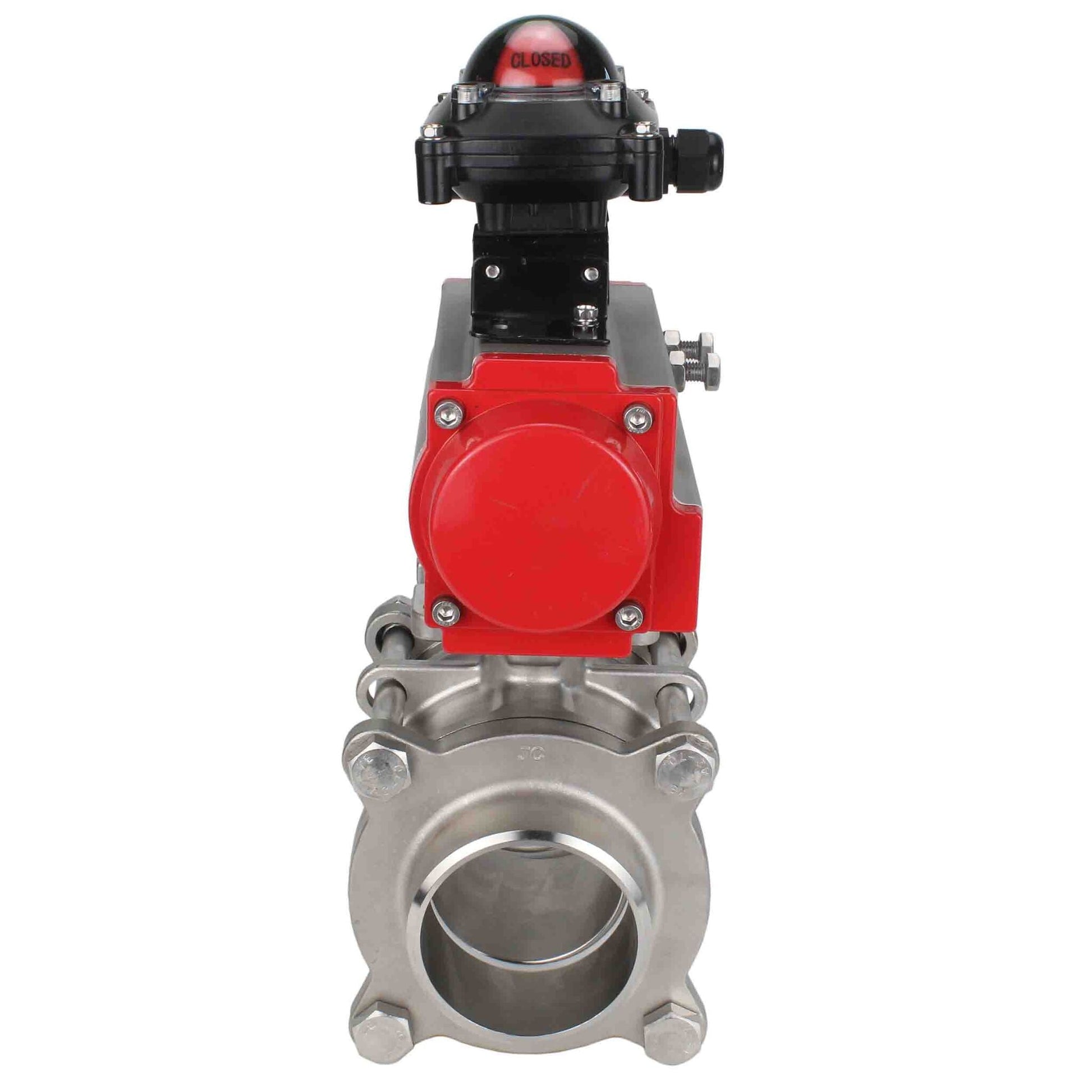 The limit switch unit is designed for visual and electrical signalling of valve end positions. It is mounted on top of the pneumatic actuator surface and connected to the actuator shaft - DIN standard. The sealed box usually contains two sensors which monitor the position of the actuator shaft and signalise the end positions. Visual indication of the position can be observed on the unit body there is a 3D visual indicator RED-CLOSED and GREEN-OPEN.