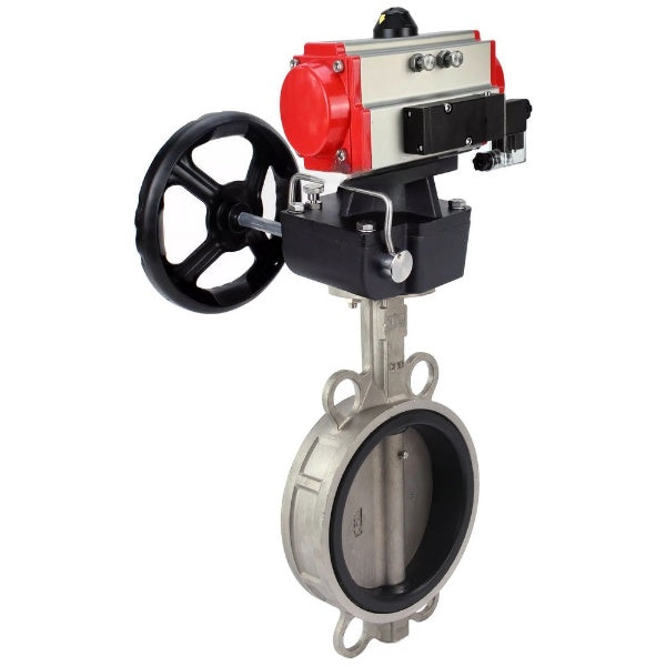 Válvula de mariposa DNOVA WBV3232E-2W-Fb-H, material del cuerpo - acero inoxidable AISI 316L, material del disco - acero inoxidable AISI 316L, junta - EPDM, con actuador neumático de doble acción PA-DA, 4V320-10 220V, volante MON