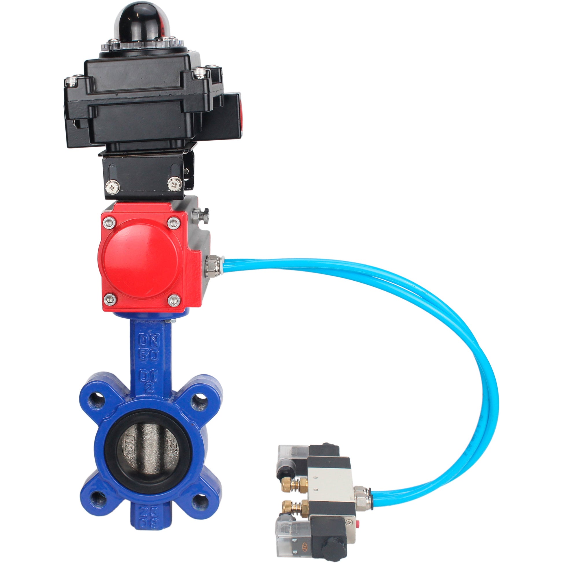 Válvulas de mariposa WBV1616E-2W-Fb-H, material del cuerpo: fundición gris QT450, material del disco: fundición gris QT450, junta: EPDM, actuador neumático PA-SA con resortes de retorno, 4V320-10 220 V, LSU APL-410N EX