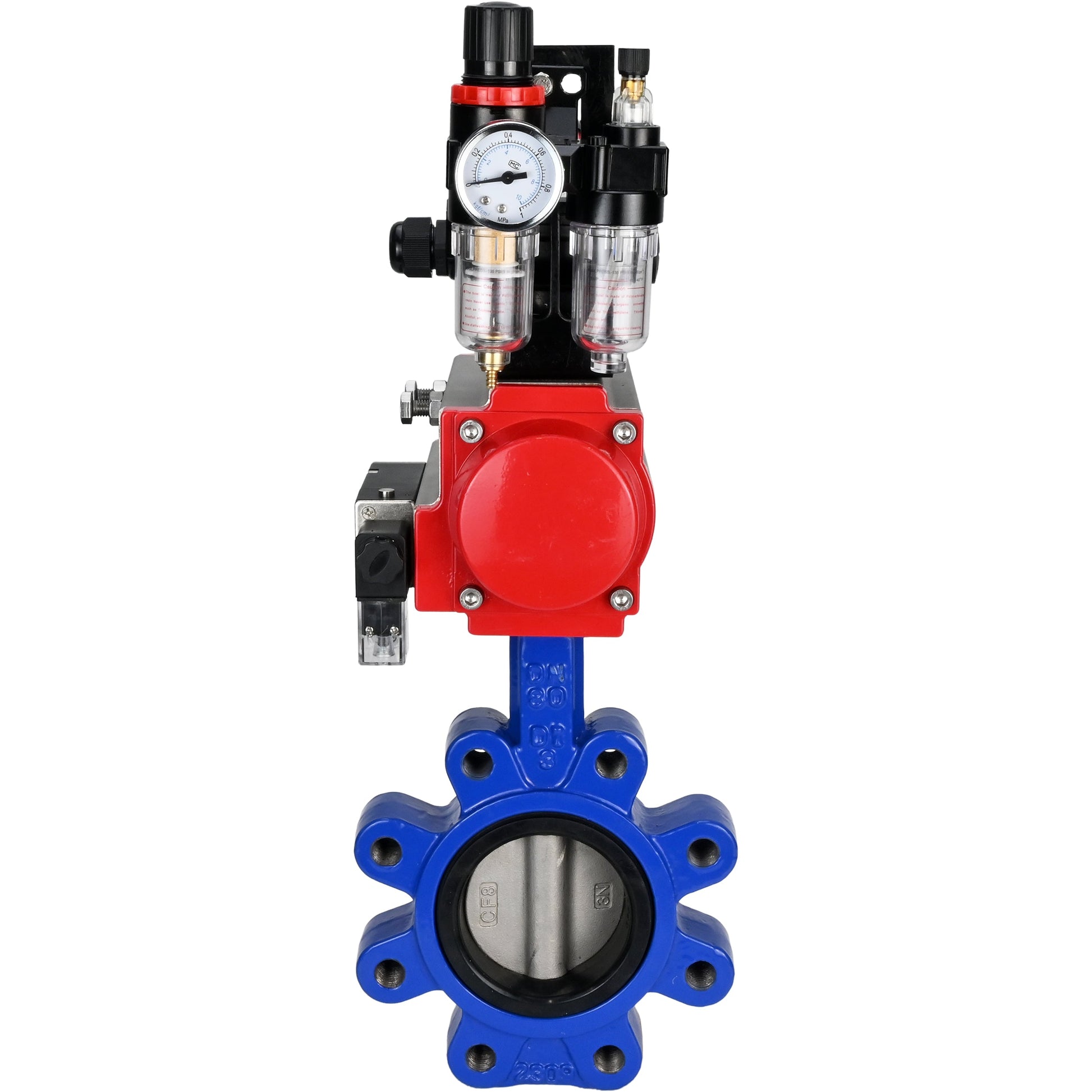 Válvula de mariposa de agua DNOVA WBV1631E-2W-Fb-H, material del cuerpo: fundición gris QT450, material del disco: acero inoxidable AISI 304, junta: EPDM, actuador neumático PA-DA de doble acción, 4M310-08 24 V, LSU APL-210N, ATU AFC2000