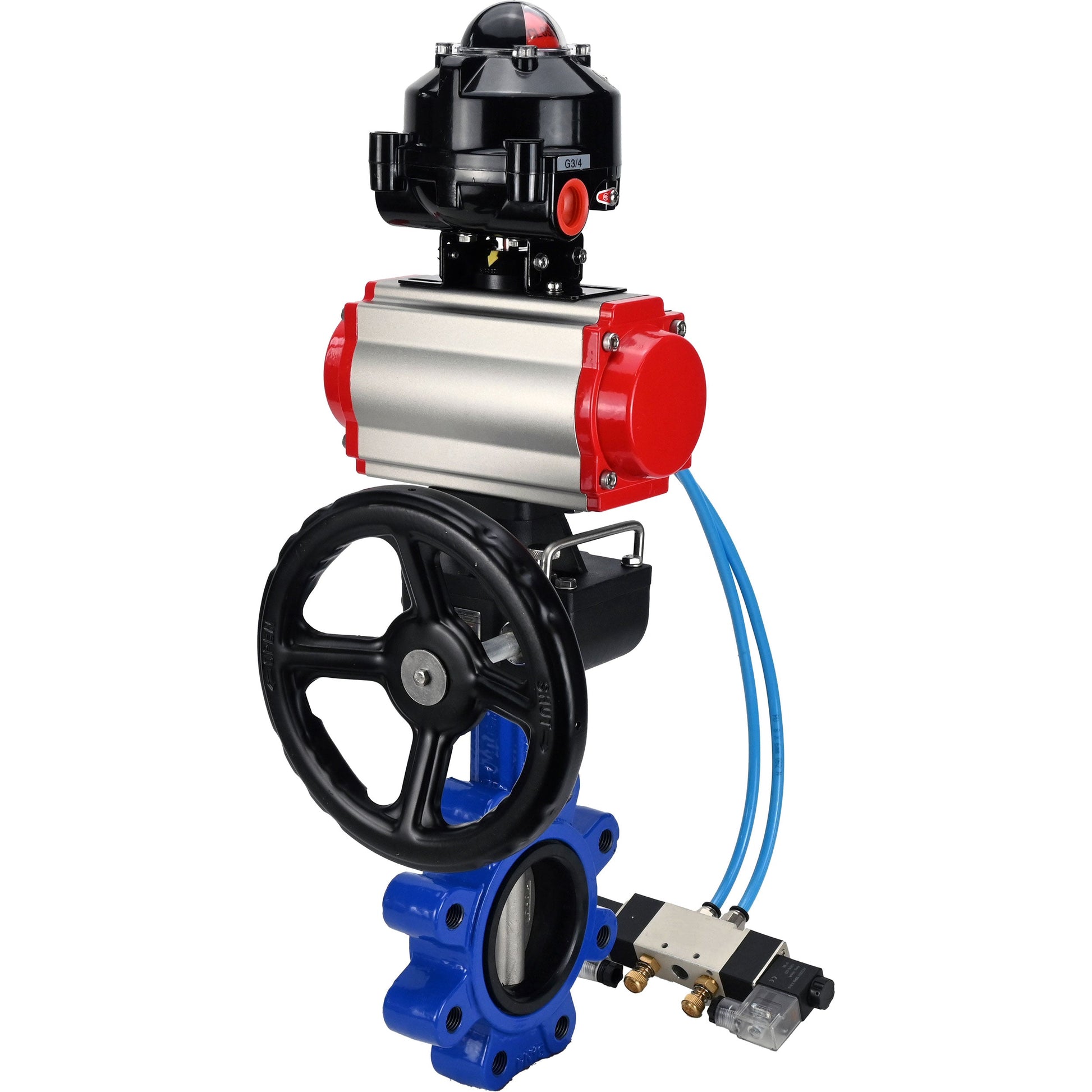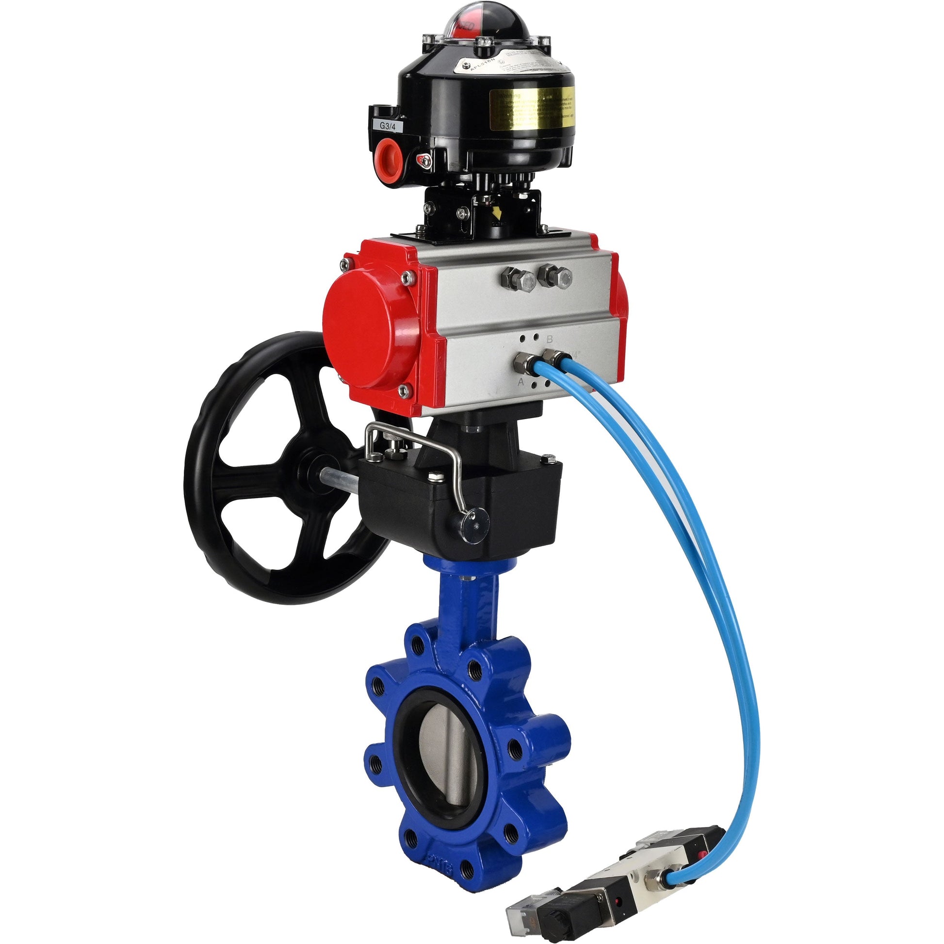 Válvulas de mariposa WBV1631E-2W-Fb-H, material del cuerpo - fundición gris QT450, material del disco - acero inoxidable AISI 304, junta - EPDM, actuador neumático PA-DA doble acción, 4V320-08 220V, LSU APL-510N EX, volante MON