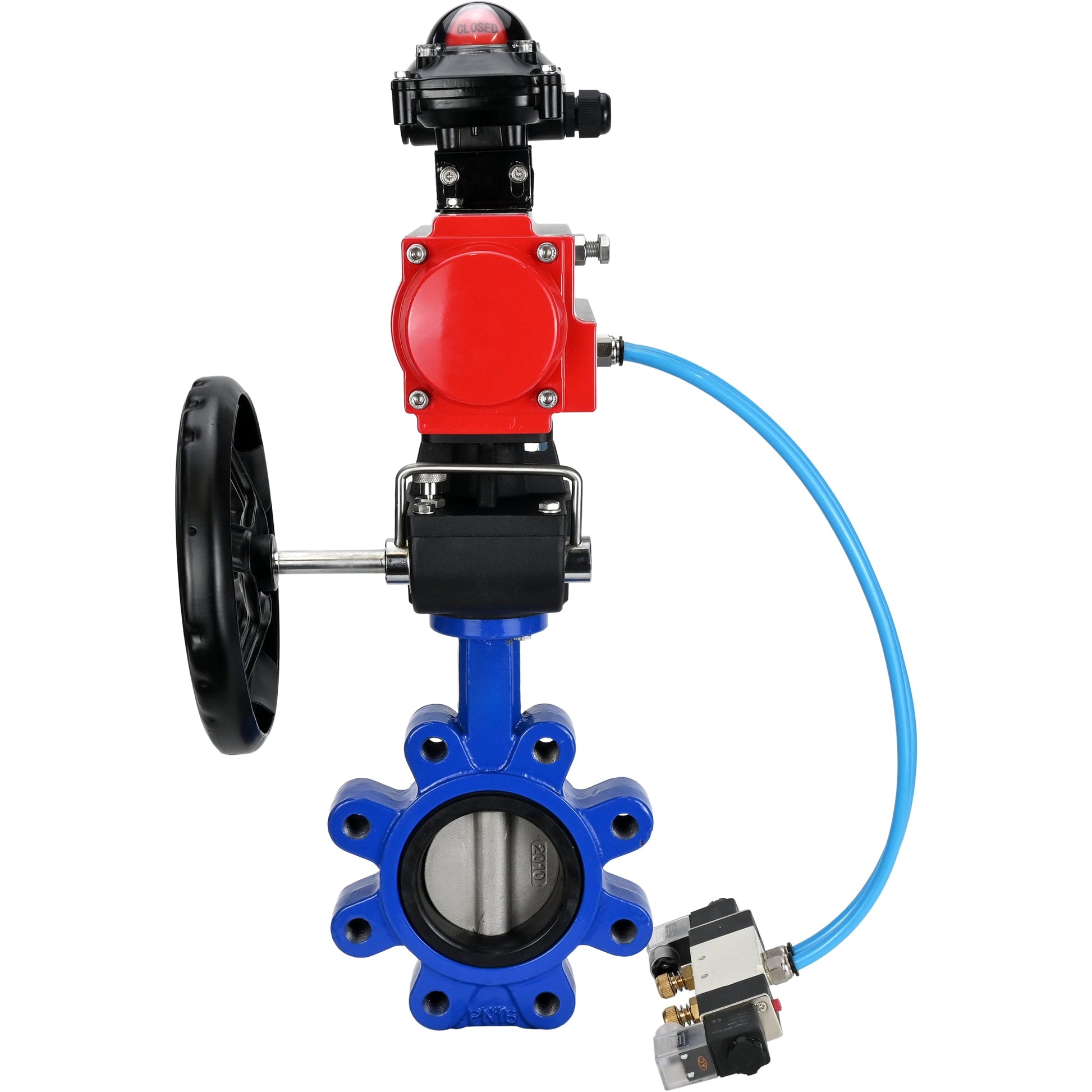 Válvulas de mariposa WBV1631E-2W-Fb-H, material del cuerpo - fundición gris QT450, material del disco - acero inoxidable AISI 304, junta - EPDM, actuador neumático PA-DA doble acción, 4V320-10 220V, LSU APL-210N, volante MON