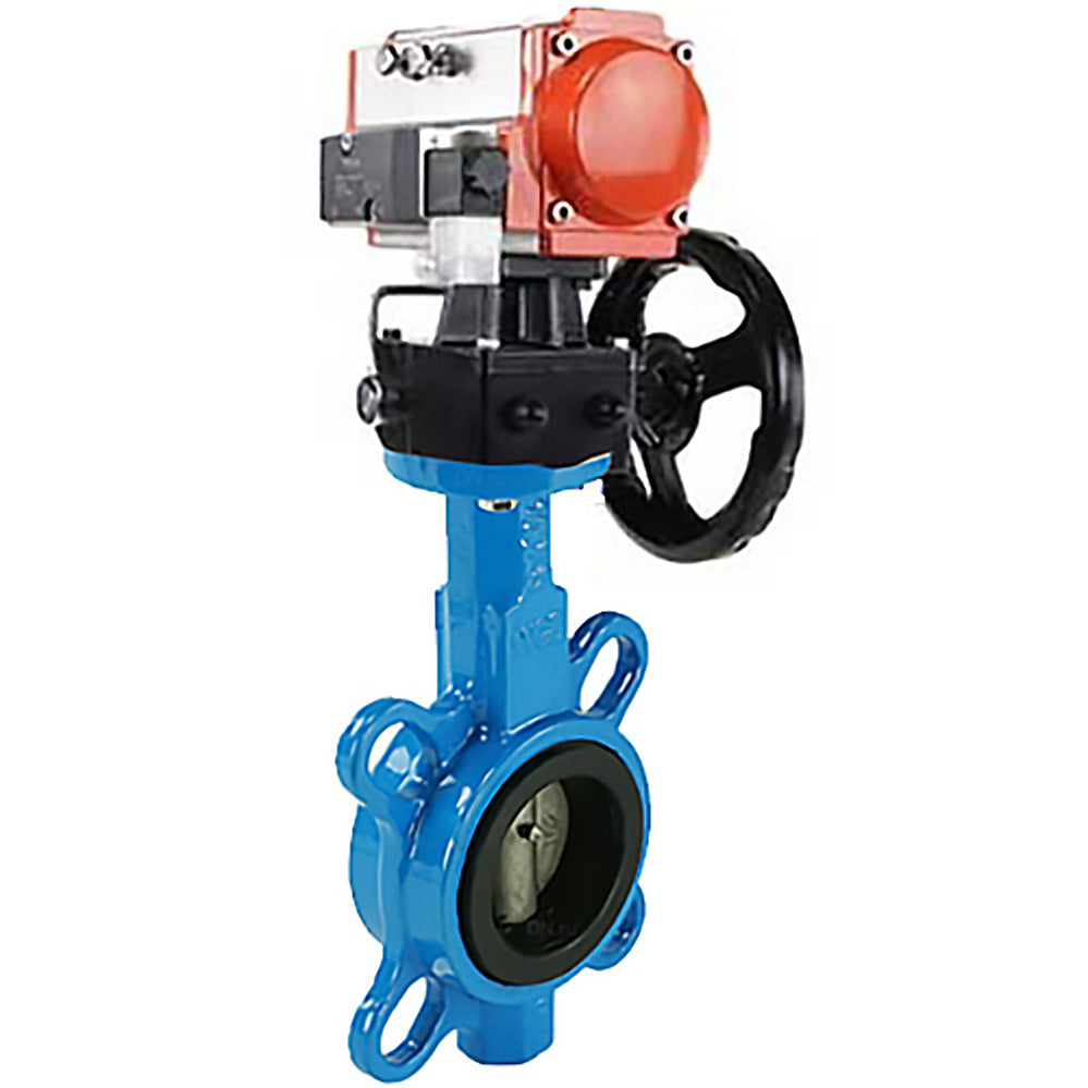 Válvulas de mariposa WBV1631N-2W-Fb-H, material del cuerpo - fundición gris QT450, material del disco - Acero inoxidable AISI 304, junta - NBR, actuador neumático PA-DA doble acción, volante MON 4M310-08 24V