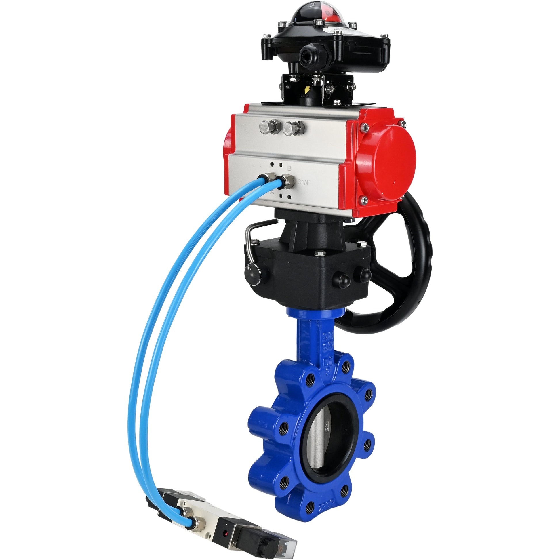 Válvulas de mariposa WBV1631N-2W-Fb-H, material del cuerpo - fundición gris QT450, material del disco - acero inoxidable AISI 304, junta - NBR, actuador neumático PA-DA doble acción, 4V320-08 220V, LSU APL-210N, volante MON