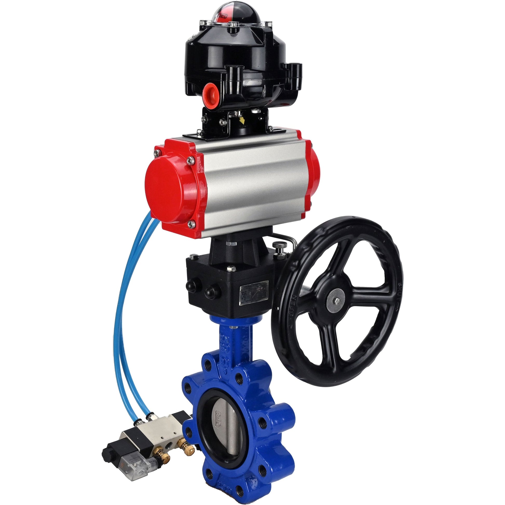 Válvulas de mariposa WBV1631N-2W-Fb-H, material del cuerpo - fundición gris QT450, material del disco - acero inoxidable AISI 304, junta - NBR, actuador neumático PA-DA doble acción, 4V320-10 220V, LSU APL-510N EX, volante MON