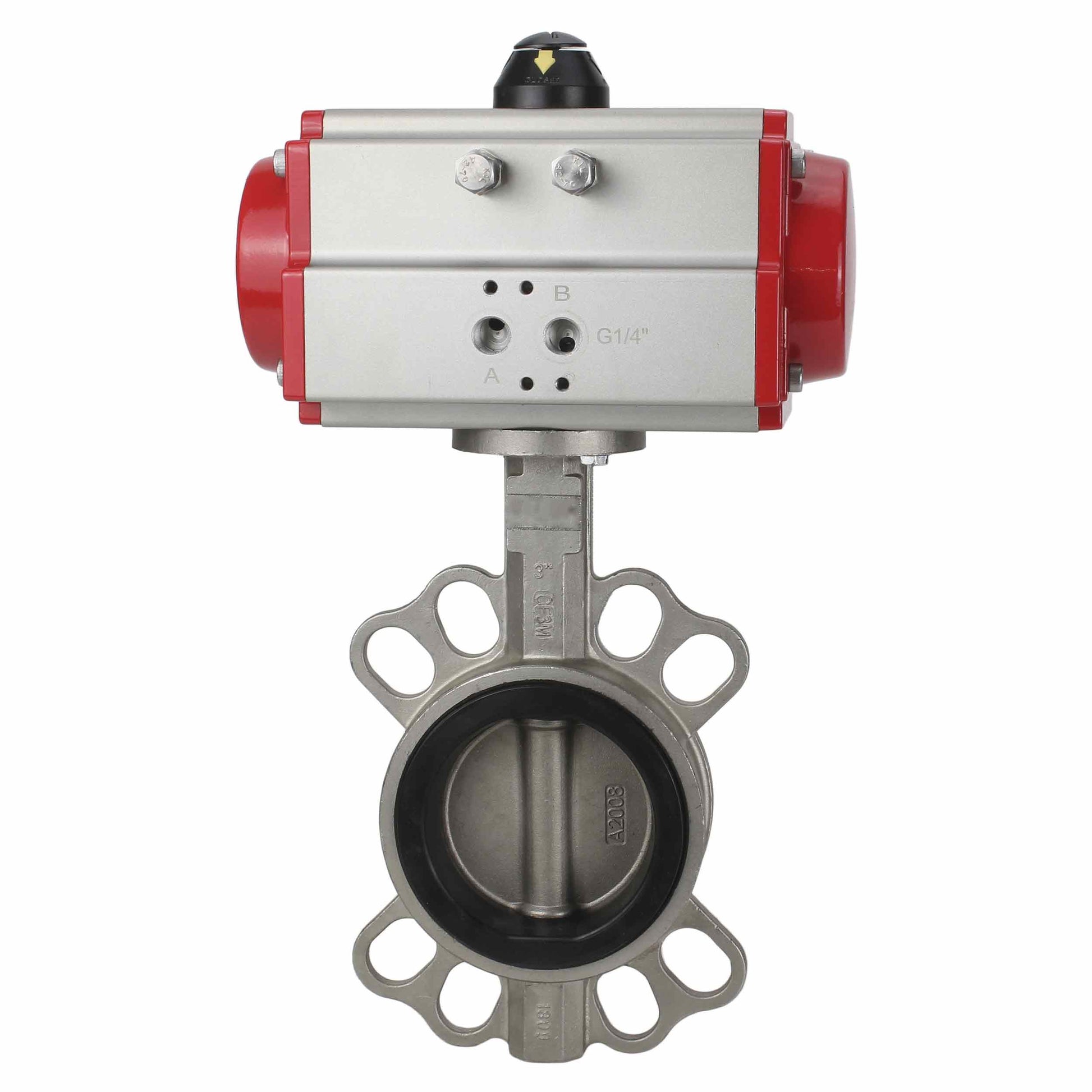 Válvulas de mariposa WBV3131N-2W-Fb-H, material del cuerpo: acero inoxidable AISI 304, material del disco: acero inoxidable AISI 304, junta: NBR, actuador neumático PA-SA con resortes de retorno.
