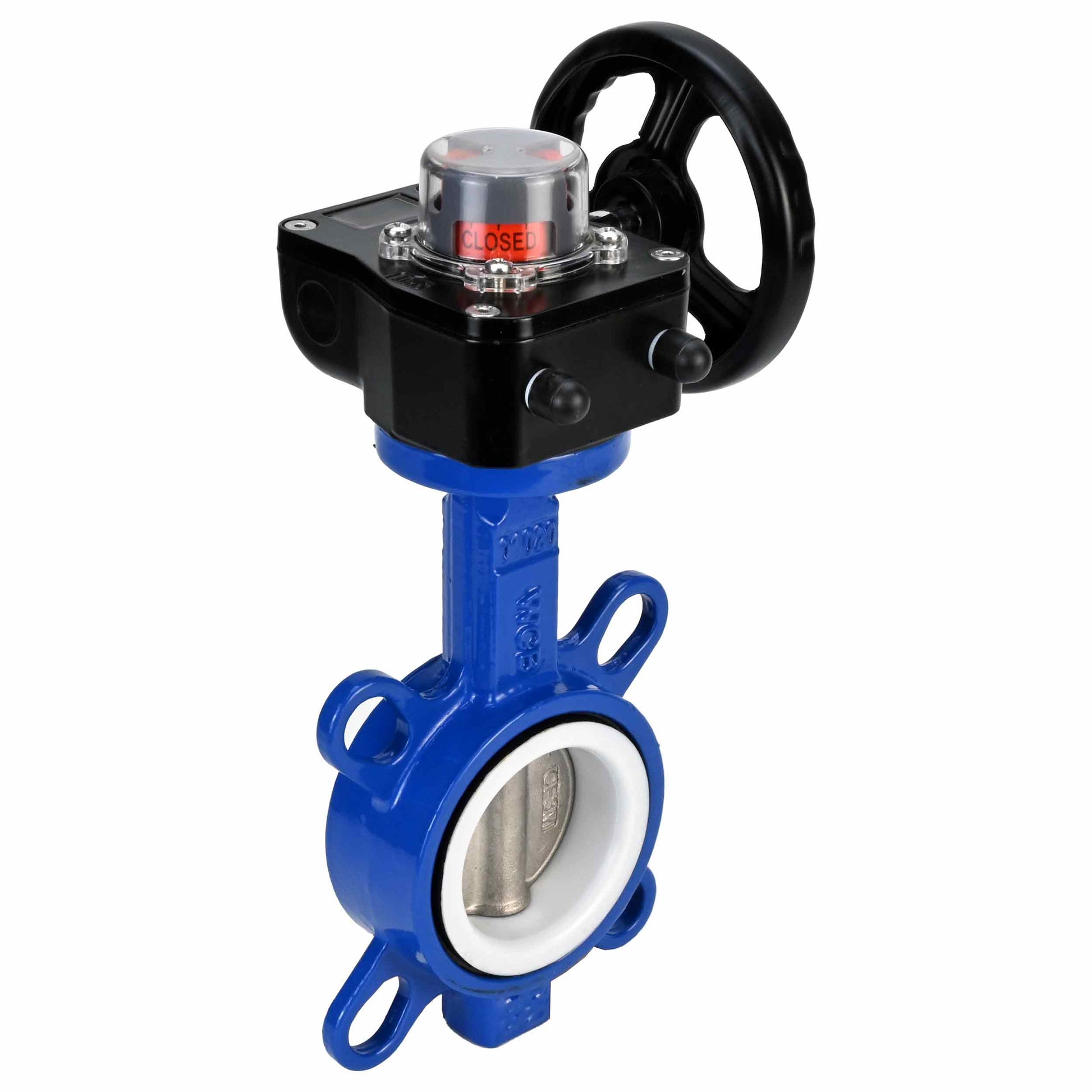 Válvula de mariposa de agua DNOVA WCB-316L-PTFE-HAM, material del cuerpo - acero al carbono WCB, material del disco - acero inoxidable AISI 316L, sello - PTFE, operada por engranajes